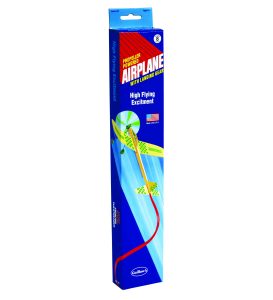A 12″ wing span propeller powered airplane. Fully wound up and launched, it climbs into the sky trailing a colorful tail streamer.