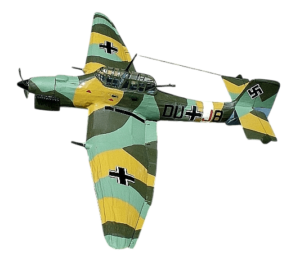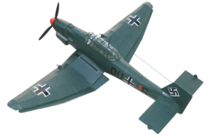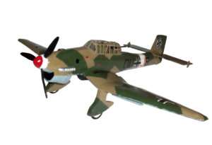 The Stuka was specifically designed for a vertical bomb run, or as popularly known as “dive-bombing”. The 87-B model was the most widely used of the Stuka’s and first saw service during the 1939 Polish Campaign. In May 1940, it successfully lead the German invasion of France and the Low Countries but, later in the year, had to be withdrawn from battle when it suffered heavy losses at the hands of Britain’s Royal Air Force during the air “blitz” of southern England. The nickname Stuka is an abbreviation of “Sturtzkampfflugzeug”- the designation given this plane by the Immelmann Dive-bomber group.