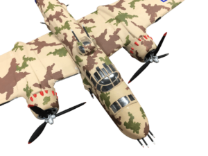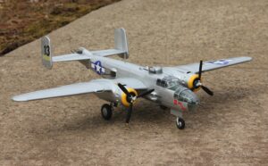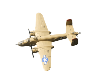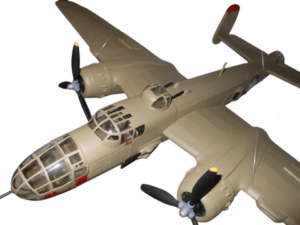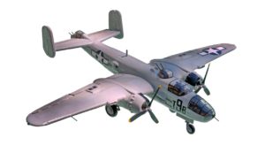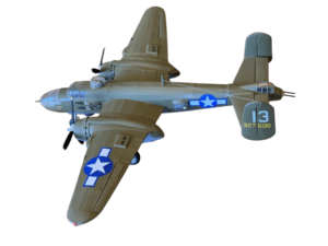 The B-25 Mitchell was one of the most outstanding medium bombers of World War 2. Conceived in mid-1939, the first production model flew in August 1940 and the first operational success was scored on December 24, 1941 with the destruction of the Japanese submarine. In April 1942, 16 B-25’s made a historic raid on Tokyo operating from the aircraft carrier USS Hornet under the command of General Doolittle- a raid that did little damage, but gave the U.S. a psychological lift during the early days of the Pacific Ocean hostilities. During the war years, the RAF, the Soviet Union, China Union, Brazil and the Netherlands also used the B-25. The “H” version with 16 guns and a 75mm cannon was the most lethal twin-engine bomber of World War 2.