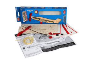 The kit contains LASER CUT balsa parts, plastic propeller & wheels, detailed stick on wing covering and rubber band motors. All you will need to complete the model is glue and wire cutters!